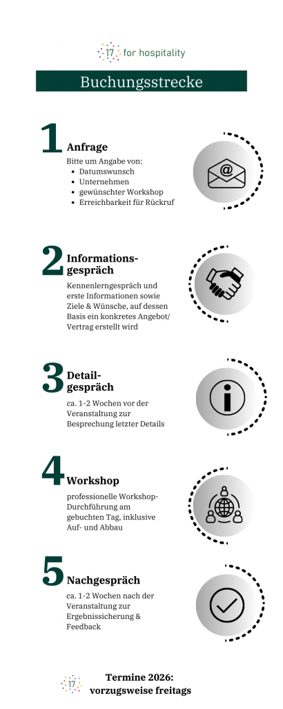 - Ausführliche Vorbesprechung und ggfs. individuelle Workshop-Anpassung